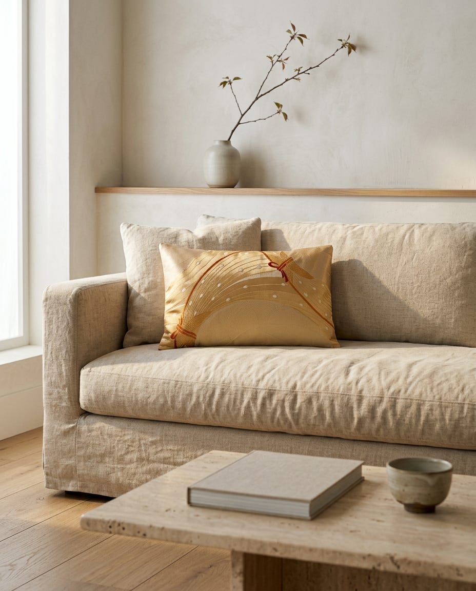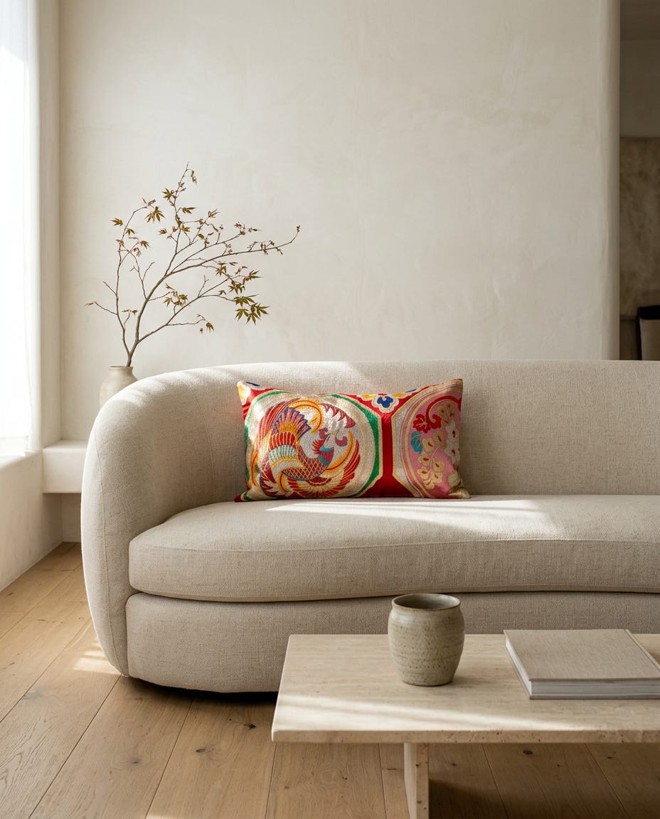 Ceremonial silk, when liberated from its original rectangular format, takes beautifully to curved applications. A lumbar pillow made from an obi allows the silk to drape and gather, revealing aspects of the weave that were not visible when the fabric was held flat for formal wearing. The same obi that read as architectural when framed becomes sensual and organic when it yields to the curves of a cushion insert or the body leaning against it.