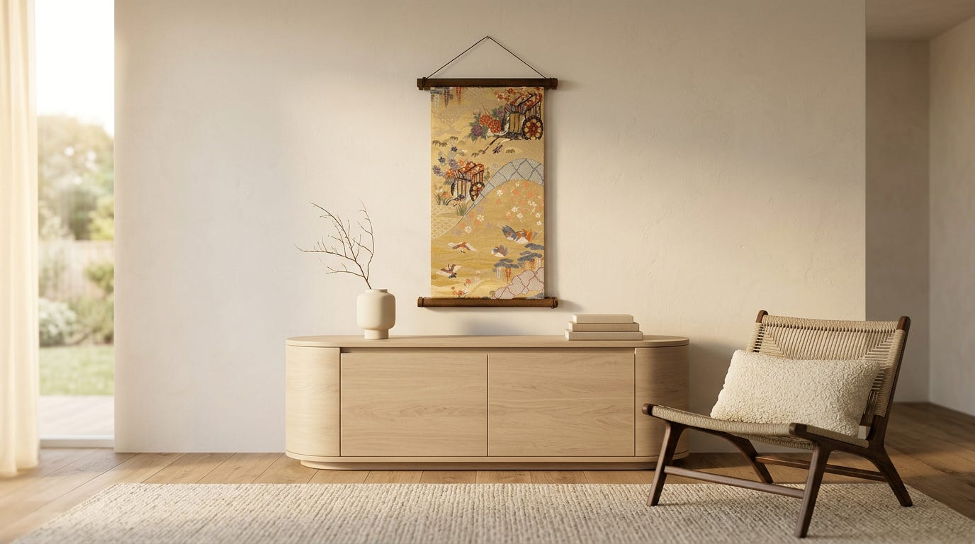 A framed obi panel reads differently than a painting not only because of its motifs, but because of its material presence. The silk itself introduces variables — texture, depth, the way light refracts through fiber rather than reflecting off a flat painted surface. In a 2026 interior that prizes the handmade and the tactile, ceremonial silk is not exotic. It is foundational.