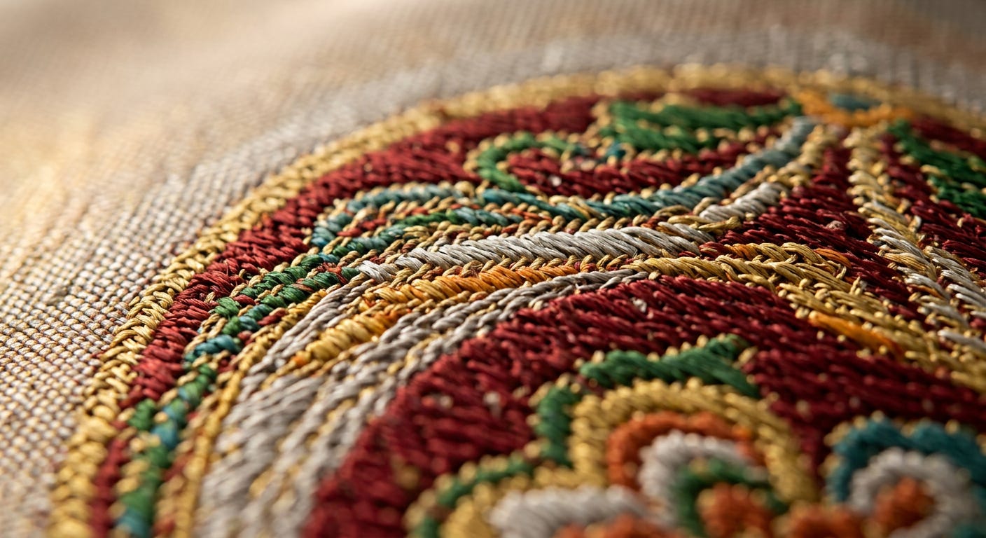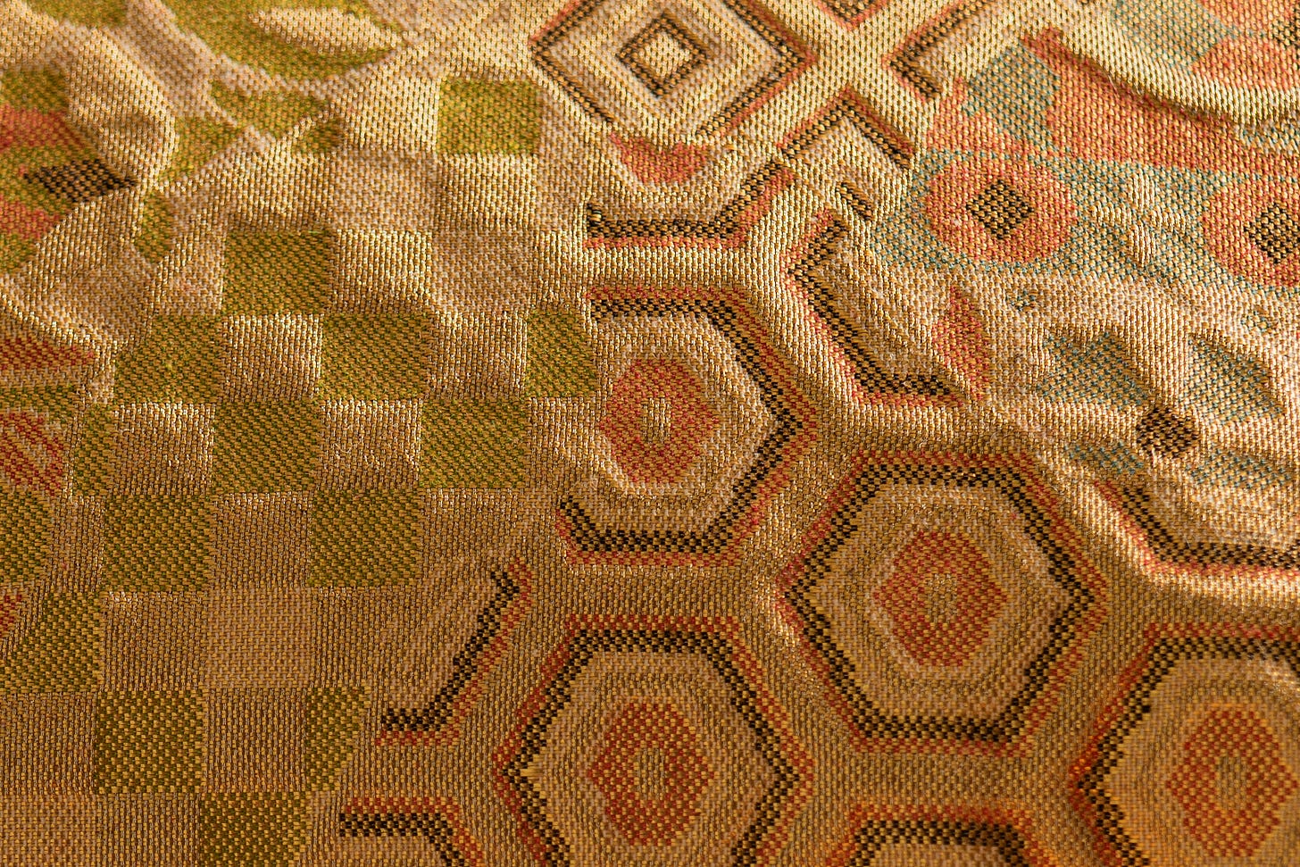 Machine-woven textiles, however beautiful, are perfectly regular. Every thread sits in its predetermined position. Every repeat of the pattern matches exactly. Ceremonial silk woven by hand, by contrast, carries what the Japanese call wabi-sabi — the small irregularities that prove human involvement. A section where the weaver’s tension shifted slightly. A repeat where the supplementary weft threads sit a millimetre higher. A dye lot where the mordant bath was a degree warmer than the previous one.