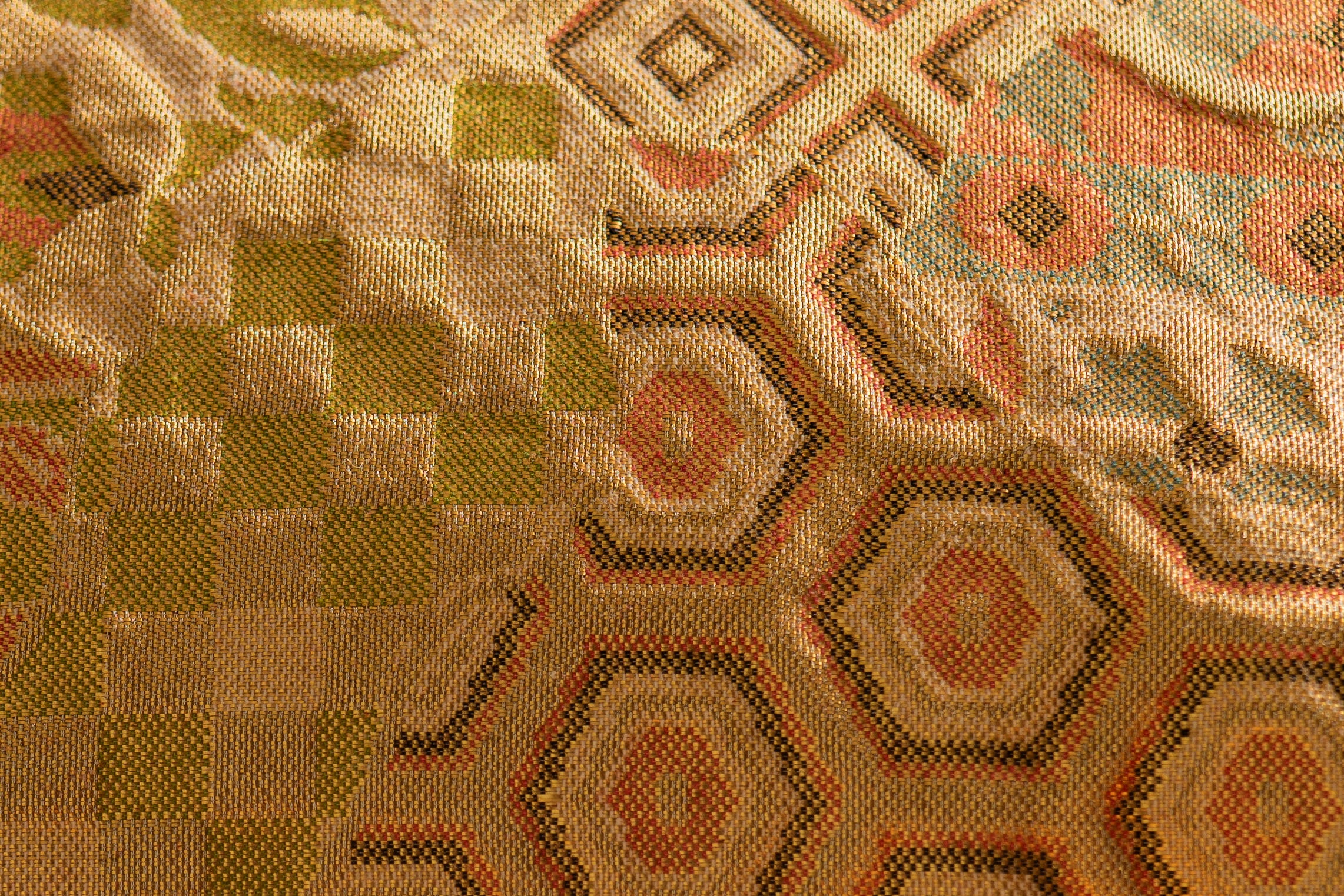 Ceremonial silk is, by its nature, one of the most tactile materials ever created for interiors. Run your hand across a piece of Nishijin brocade and you feel the irregularity of hand-thrown weft, the slight thickness variation that tells you someone sat at a loom. The surface is not flat — it has topography. An obi woven in karaori technique has an almost bas-relief quality, where the supplementary weft threads catch light at different angles depending on the viewing position and the time of day.
