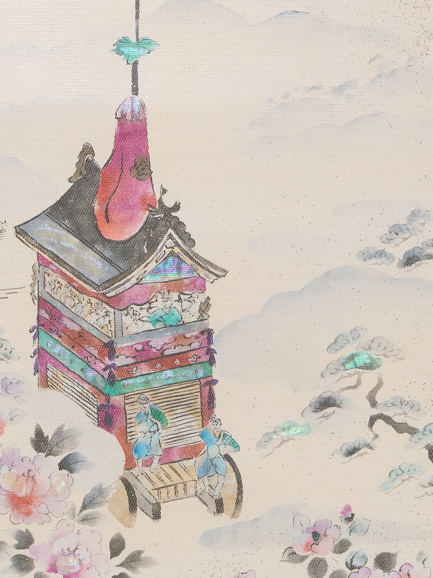 A pale, luminous white-gold — the warmth of the gold ground that appears in the most ceremonial uchikake and furisode — is not paint and not dye but woven metallic thread: strips of gold foil laminated to a paper backing and cut into thread-width lengths for incorporation into the weft. This technique, known as 金糸 (kinshi), produces a chromatic surface that no dye can approach: a colour that is also a texture, a material fact about precious metal in the presence of light.