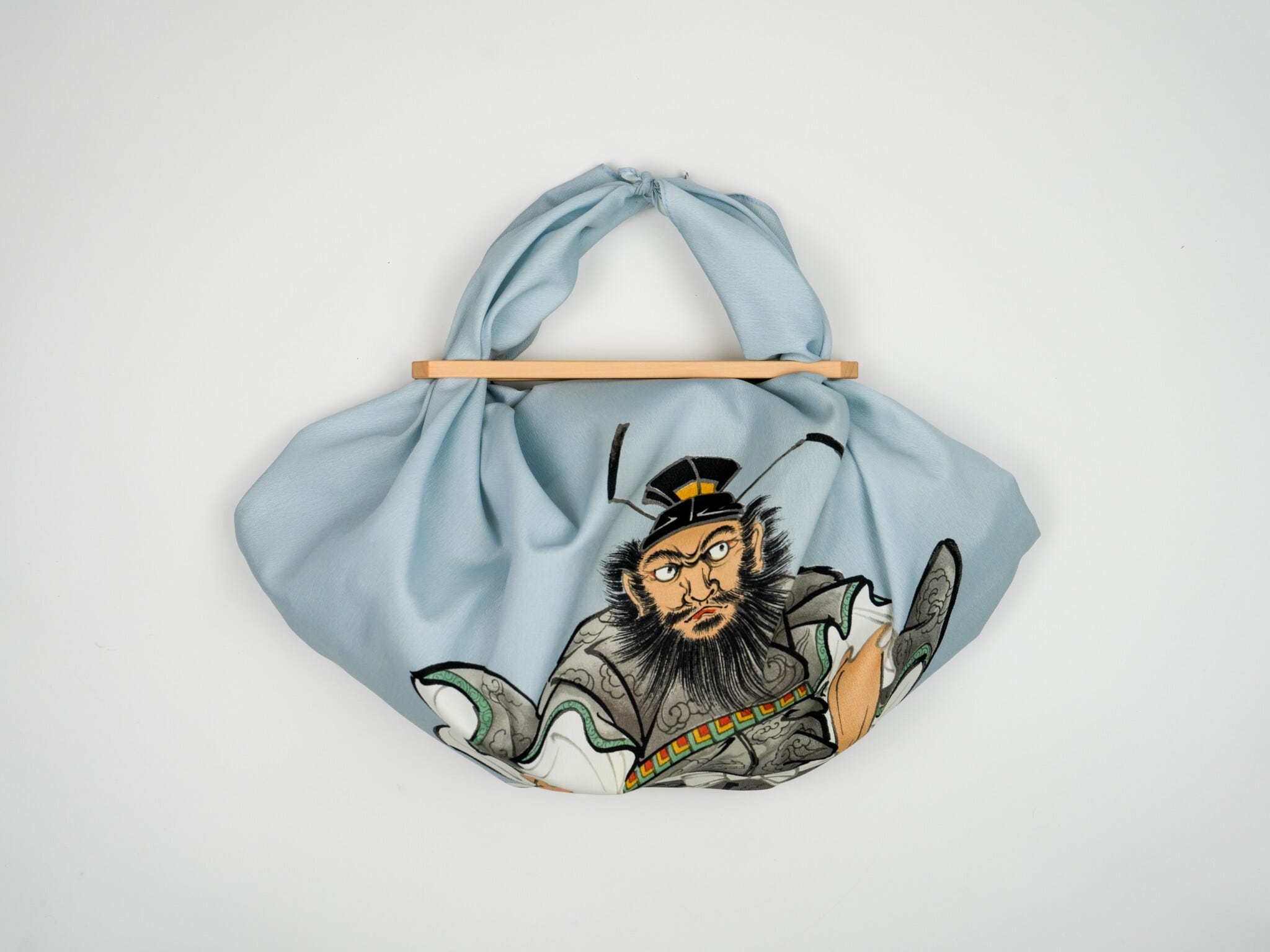 Two pieces of shaped wood — lacquered, or left natural, or somewhere between the two, which is its own kind of decision. Through them, a furoshiki is threaded: a square of cloth, folded, knotted, briefly a bag.